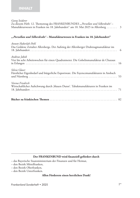 Das Sonderheftheft 2025 des 77. Jahrgangs der Zeitschrift FRANKENLAND präsentiert die Beiträge des diesjährigen 12. Fränkischen Thementages des FRANKENBUNDES, der sich am 10. Mai 2025 im Gilardi-Haus in Allersberg ‚Porzellan und Silberdraht‘ widmete.Bei dem Thema ging es um das Manufakturwesen in Franken im 18. Jahrhundert, wobei die Vielfalt großbetrieblicher Produktion vor der Industrialisierung anhand einiger ausgewählter Beispiele beleuchtet wurde. In dem Zusammenhang wurden sowohl wirtschafts- und unternehmensgeschichtliche wie kultur- und kunsthistorische Aspekte berücksichtigt.