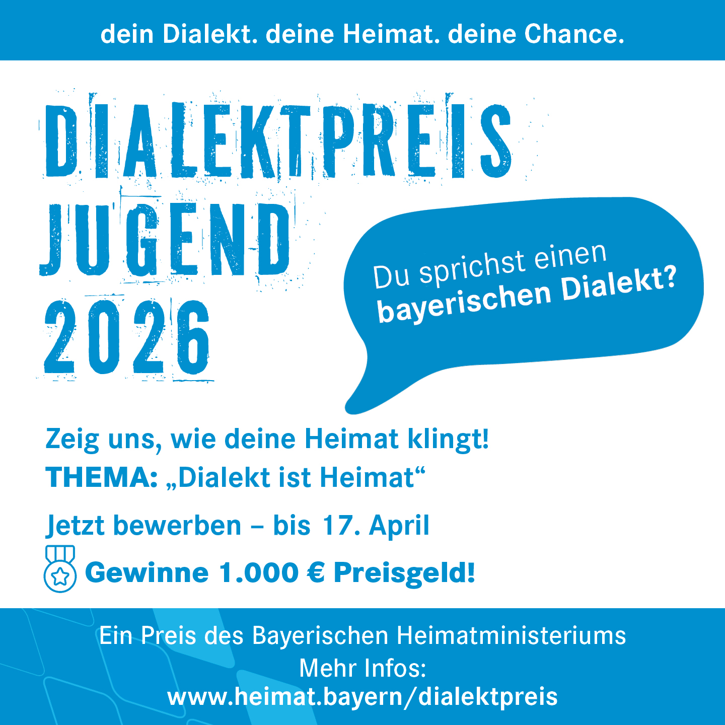 Der Dialektpreis Jugend 2026 des Bayerischen Staatsministeriums der Finanzen und für Heimat sucht kreative Beiträge zum Thema „Dialekt ist Heimat“. Teilnehmen können junge Menschen zwischen 10 und 27 Jahren – etwa mit Videos, Reels, Liedern, Gedichten, Geschichten oder anderen kreativen Formaten in einem bayerischen Dialekt. Es werden bis zu drei Preise à 1.000 Euro vergeben. ... Weiterlesen |